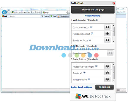 AVG Do Not Track đem lại cho bạn sự kiểm soát tính riêng tư. Điều này sẽ giúp xác định và ngăn chặn Ad Network, Social Button và Web Analytic mà đang có khả năng theo dõi hoạt động của bạn. Ngoài ra, bạn có thể tùy chọn để thông báo những trang web liên quan đến preference của bạn không được theo dõi.