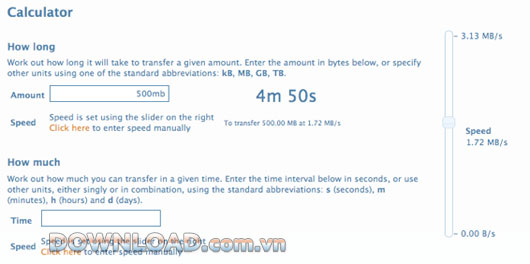 Tiện ích Calculator cho bạn biết thời gian sẽ mất để upload hoặc download file, hoặc lượng dữ liệu bạn có thể truyền tải trong thời gian nhất định