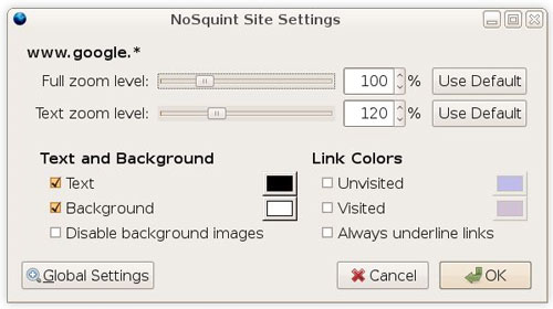 NoSquint 2.1 là công cụ cho phép người dùng điều chỉnh cỡ chữ, màu sắc cũng như tùy biến và làm đơn giản giao diện chung của một trang web.